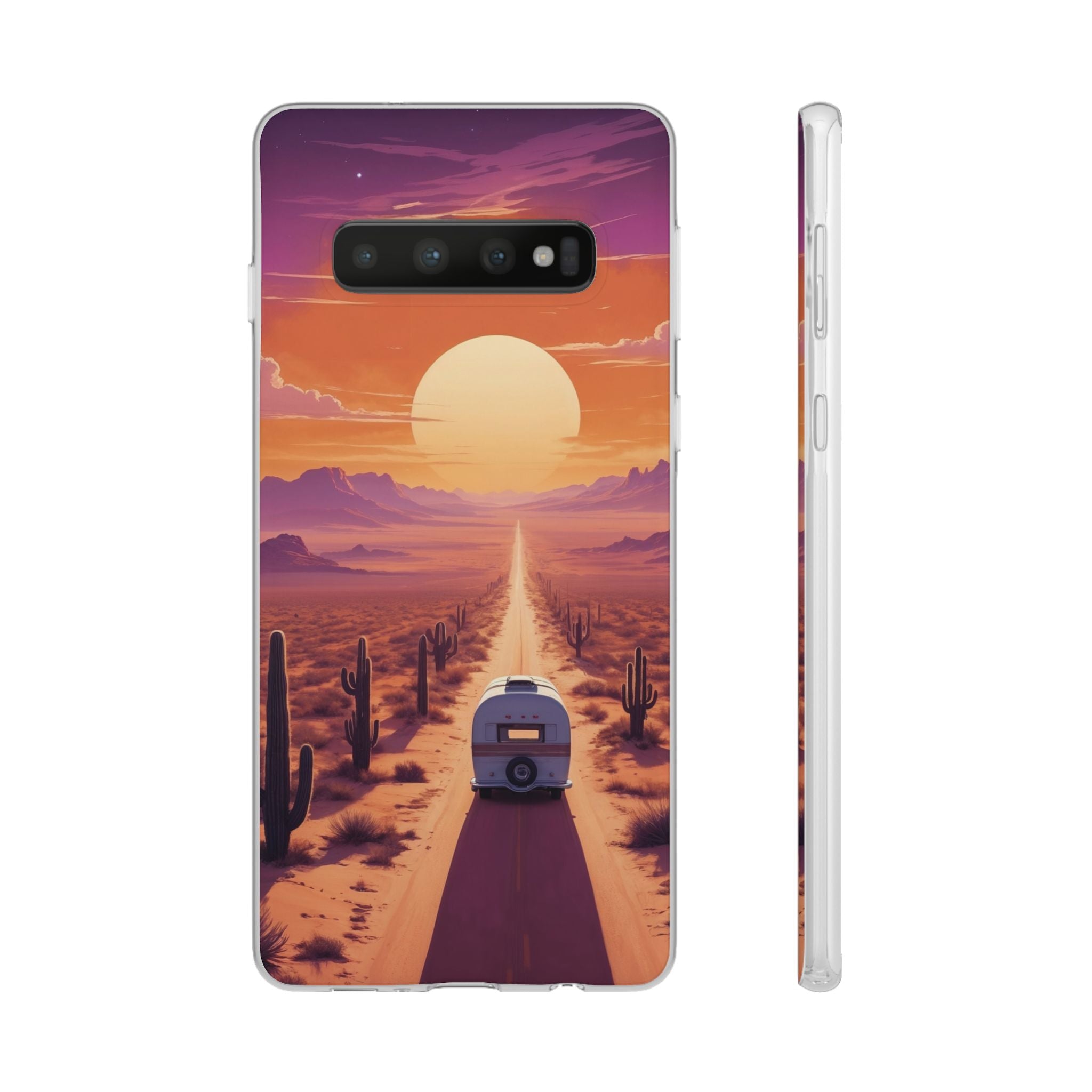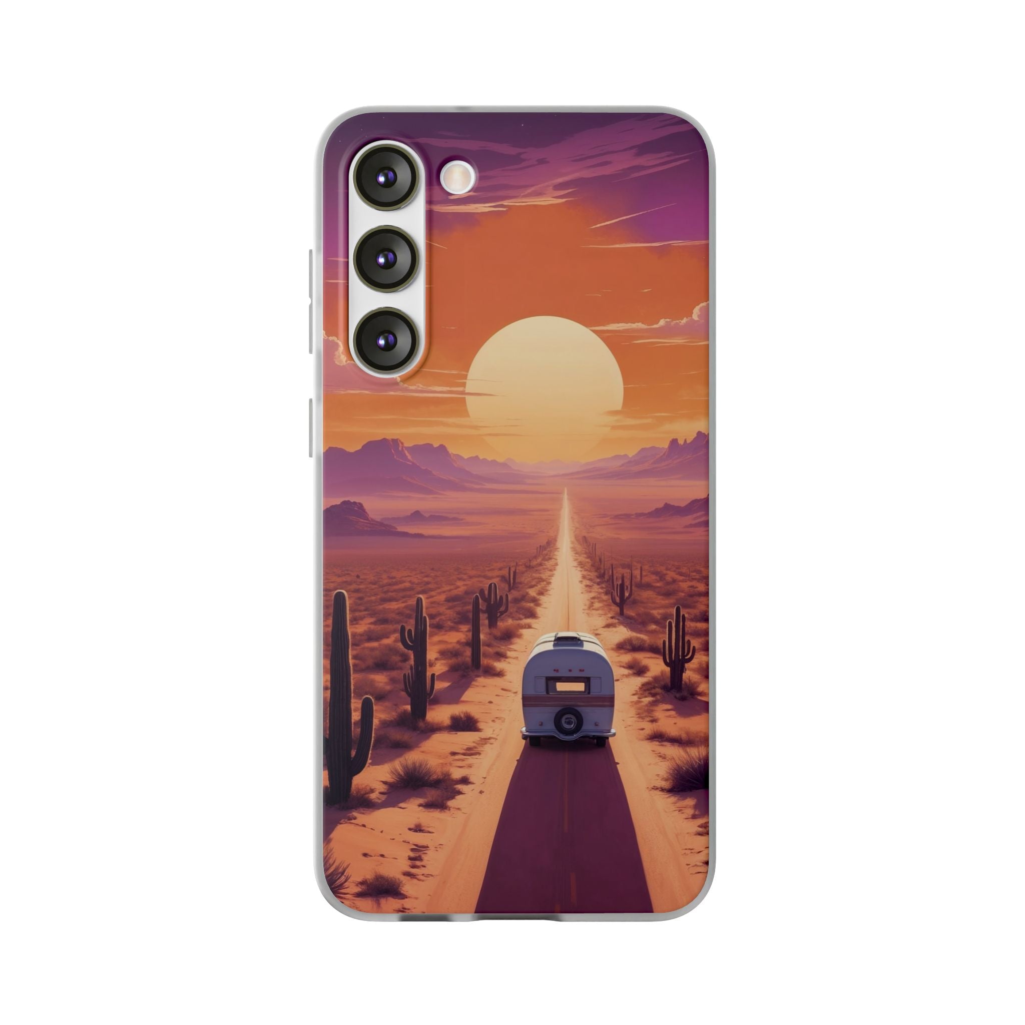 Embrace the spirit of wide-open spaces with our Desert Road Adventure phone case. This stunning design features a lone camper...
