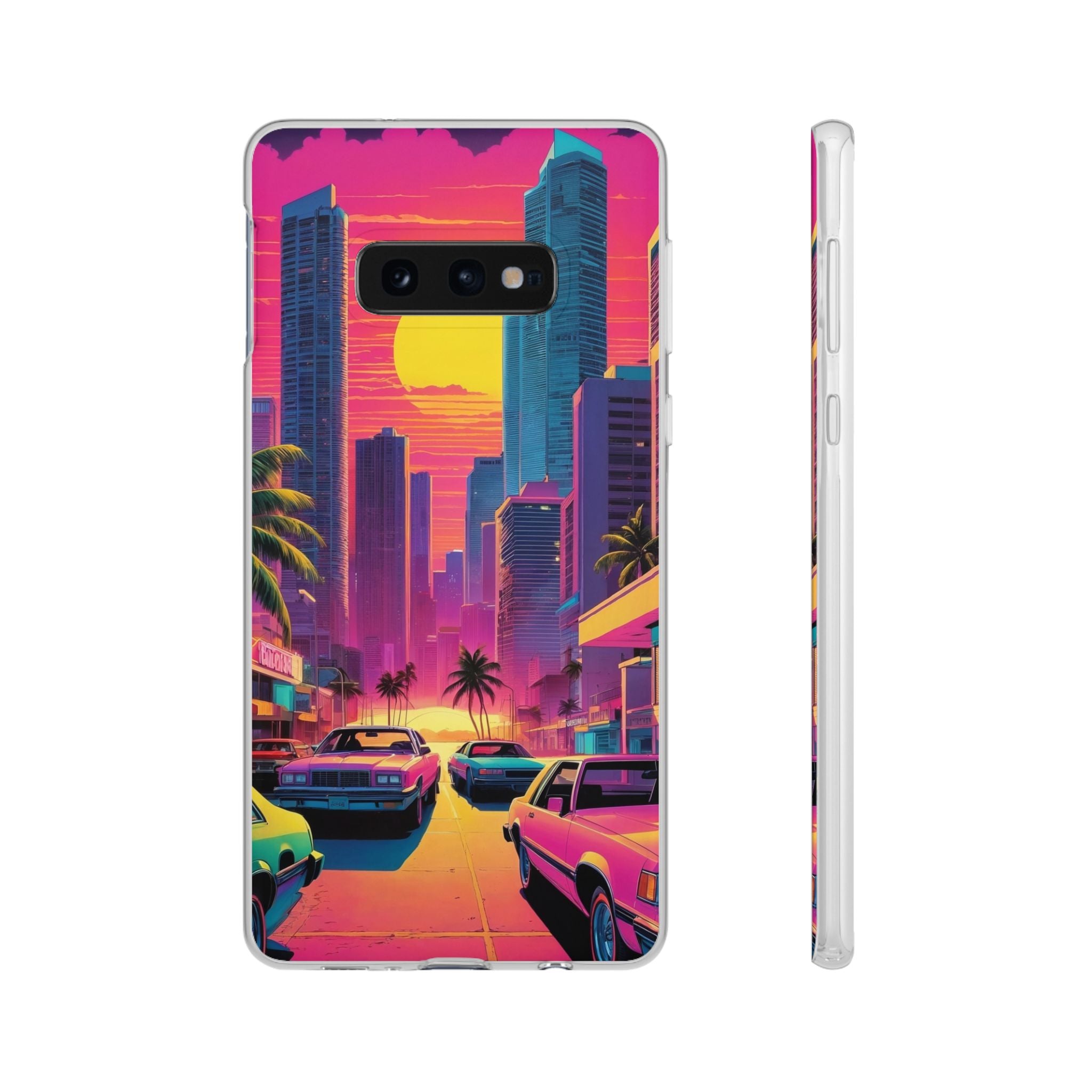 Step into a synthwave dream with the Neon Drive: Sunset City Edition phone case. Featuring a glowing yellow sun, towering...