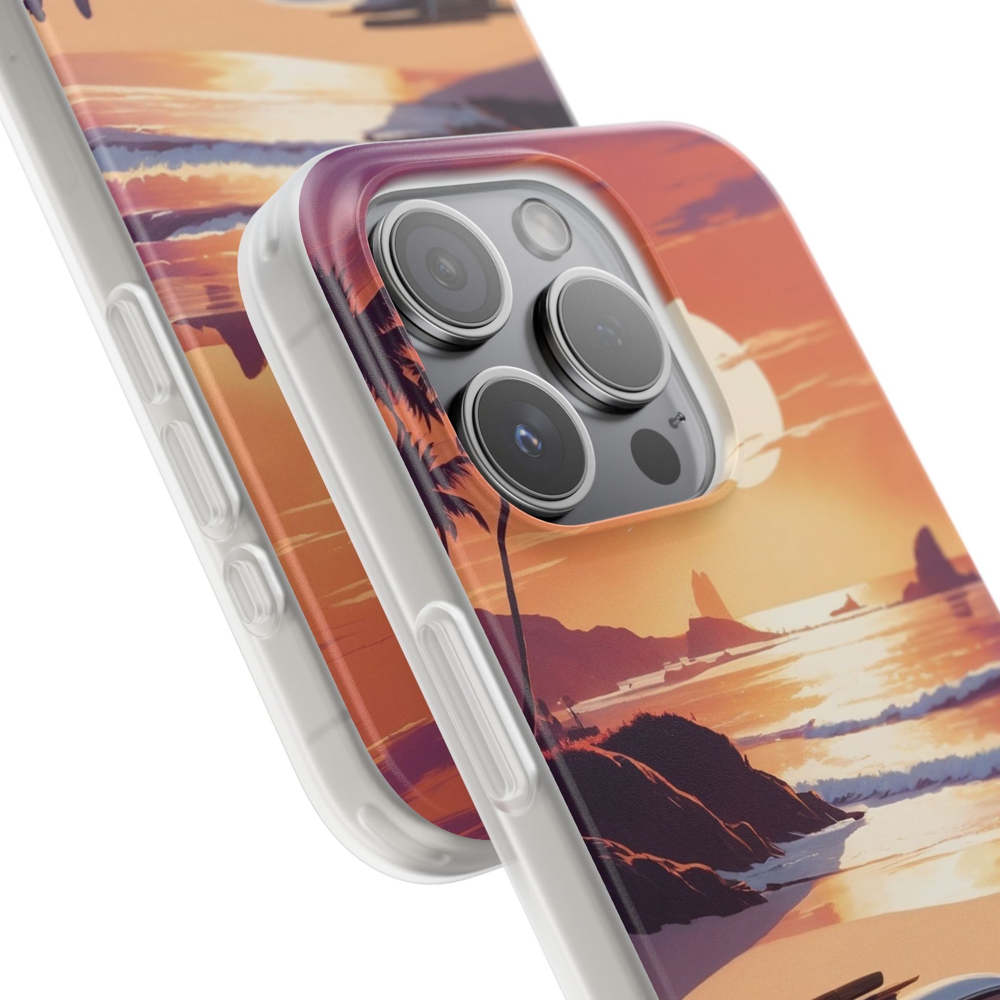 Capture the magic of golden hour with our Beach Bonfire Sunset phone case. Featuring a retro VW camper parked by the shore, surfboards on the roof, and friends gathered around a glowing beach fire, this design evokes warm summer evenings and carefree adventures.