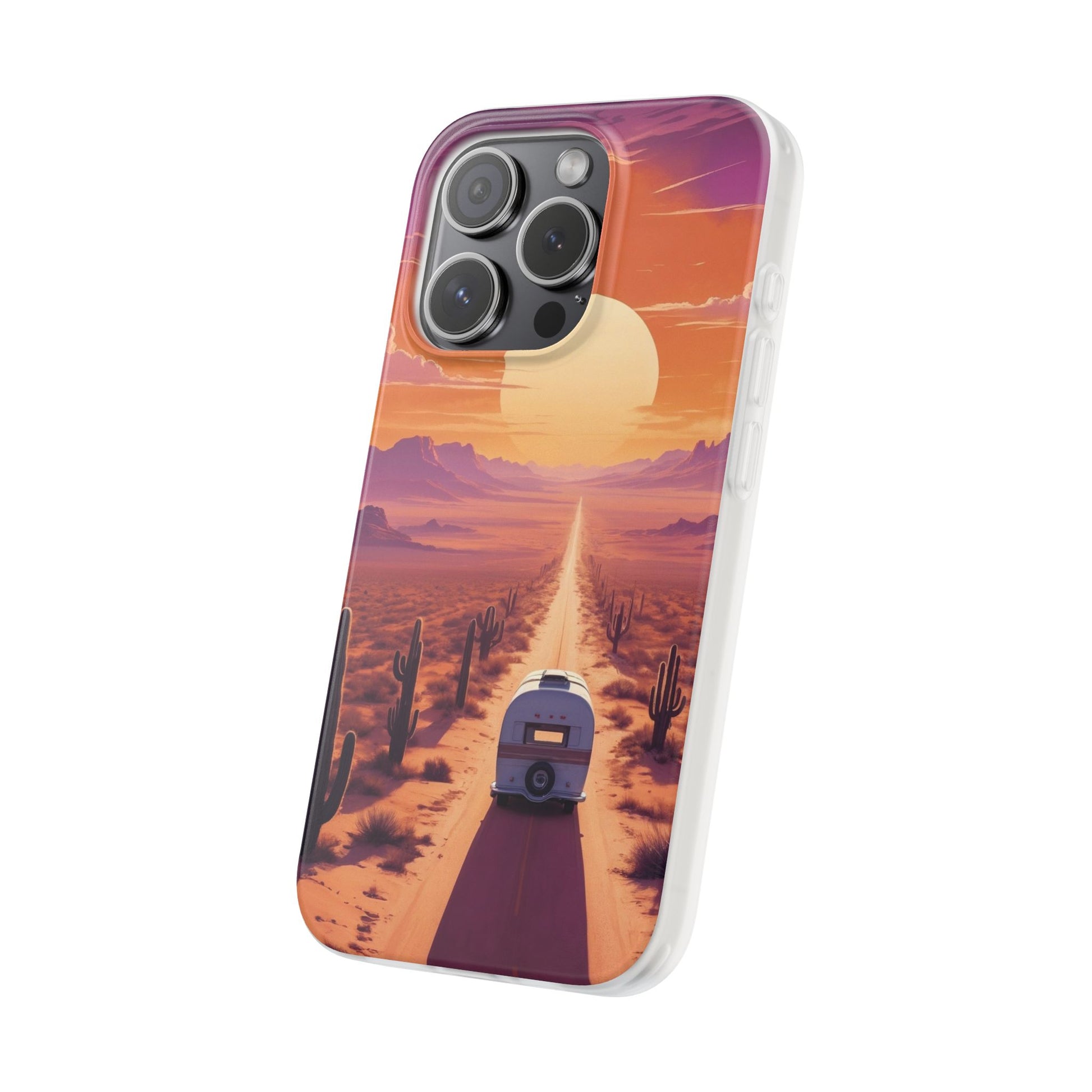 Embrace the spirit of wide-open spaces with our Desert Road Adventure phone case. This stunning design features a lone camper trailer cruising along a sunlit desert highway, framed by tall cacti and rugged mountain silhouettes. The dramatic orange and purple sunset captures the raw beauty and freedom of life on the open road.