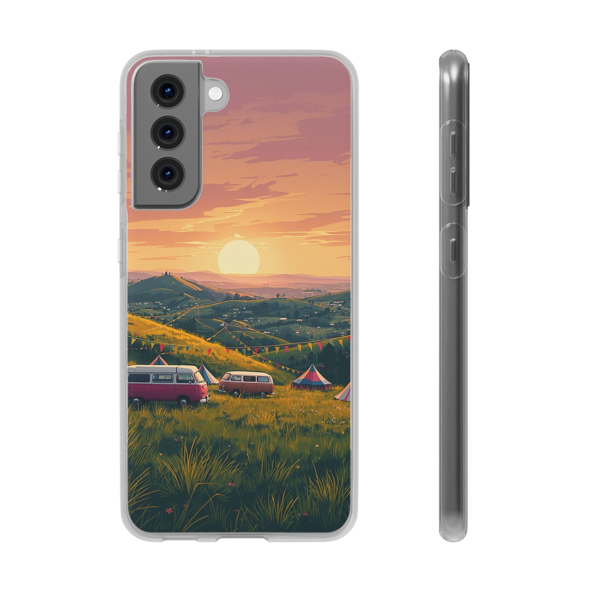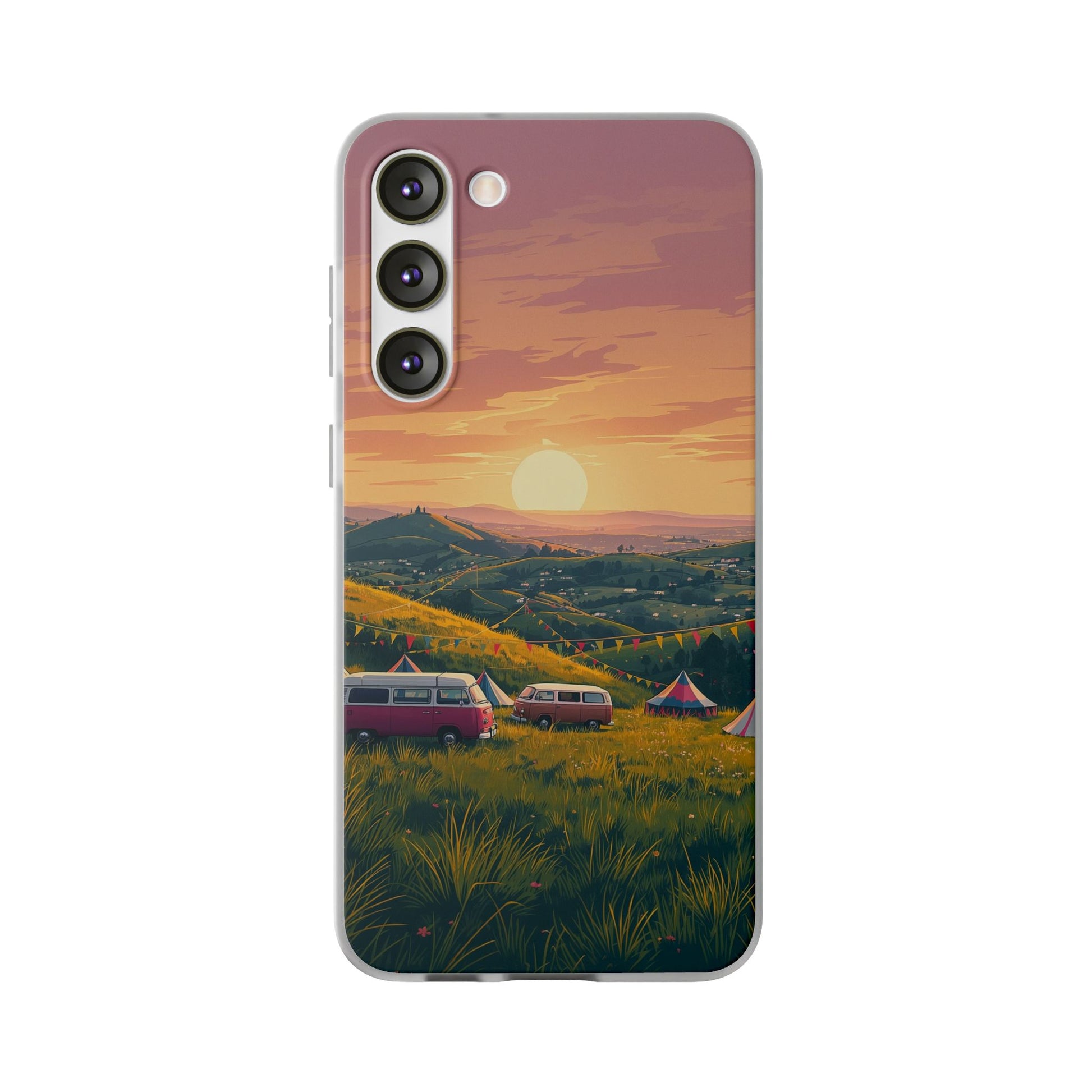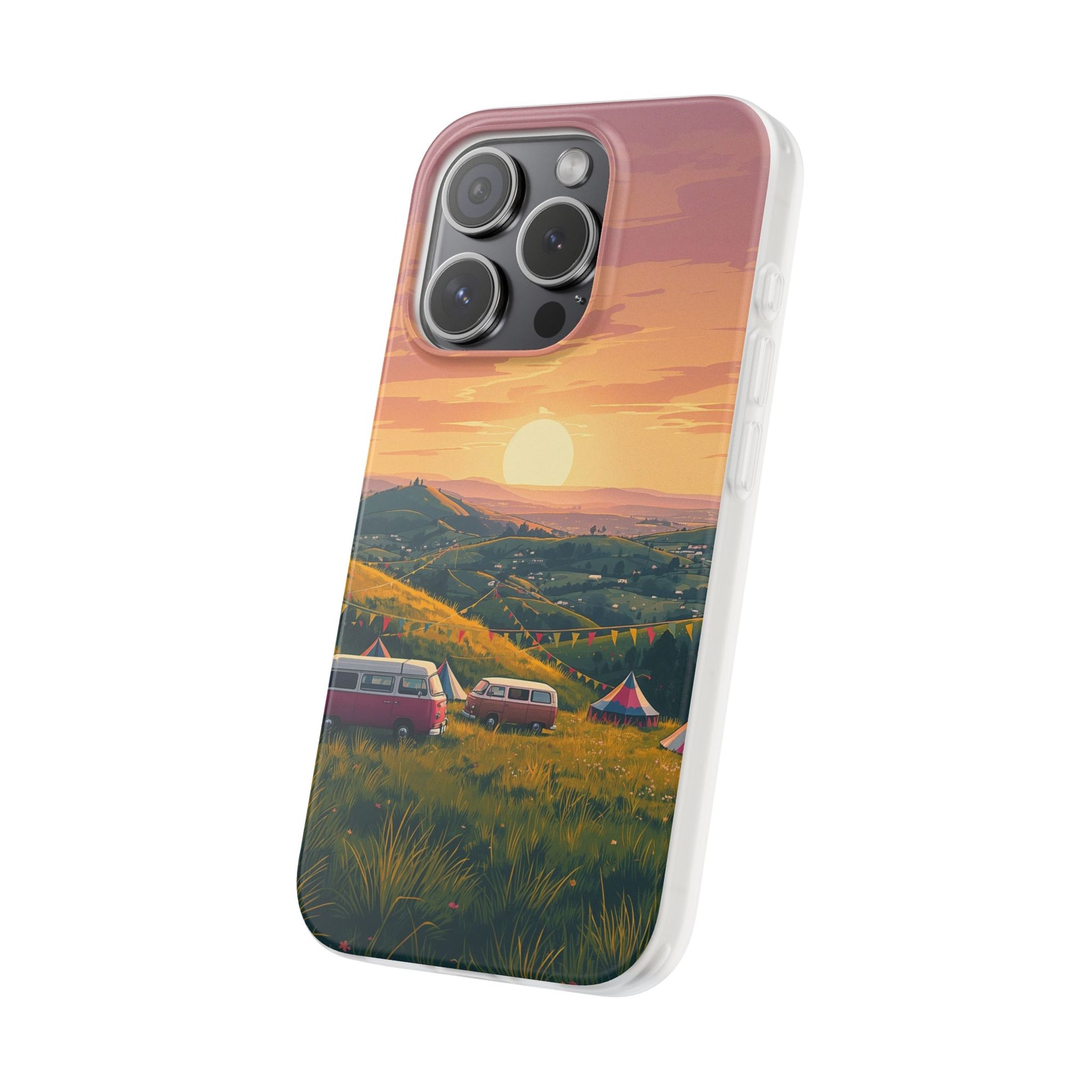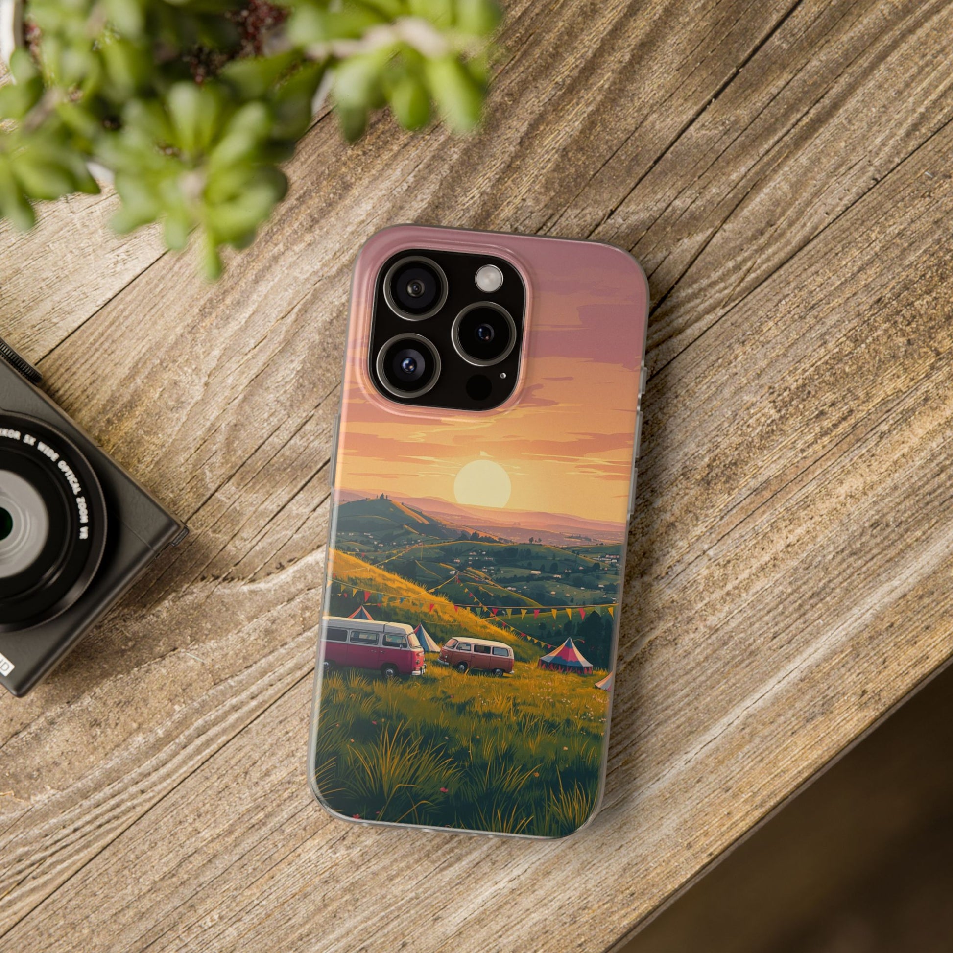 Celebrate summer freedom with our Festival Fields phone case. This vibrant design captures a glowing sunset over rolling green hills, colourful tents, bunting flags fluttering in the breeze, and retro campervans parked in the grass. It’s the perfect tribute to music festivals, road trips, and golden evenings spent under open skies.