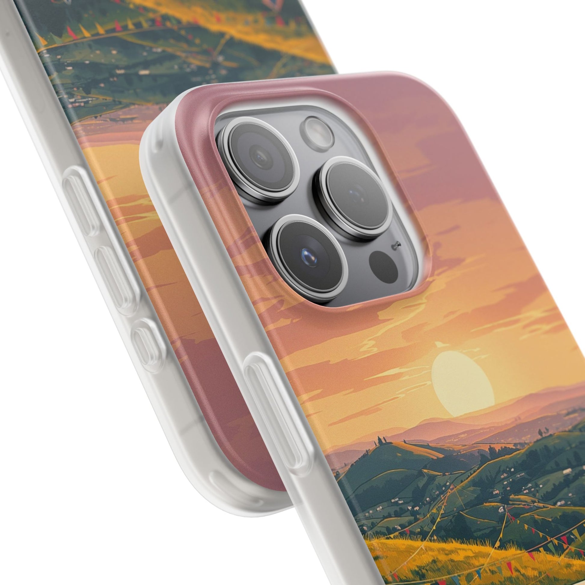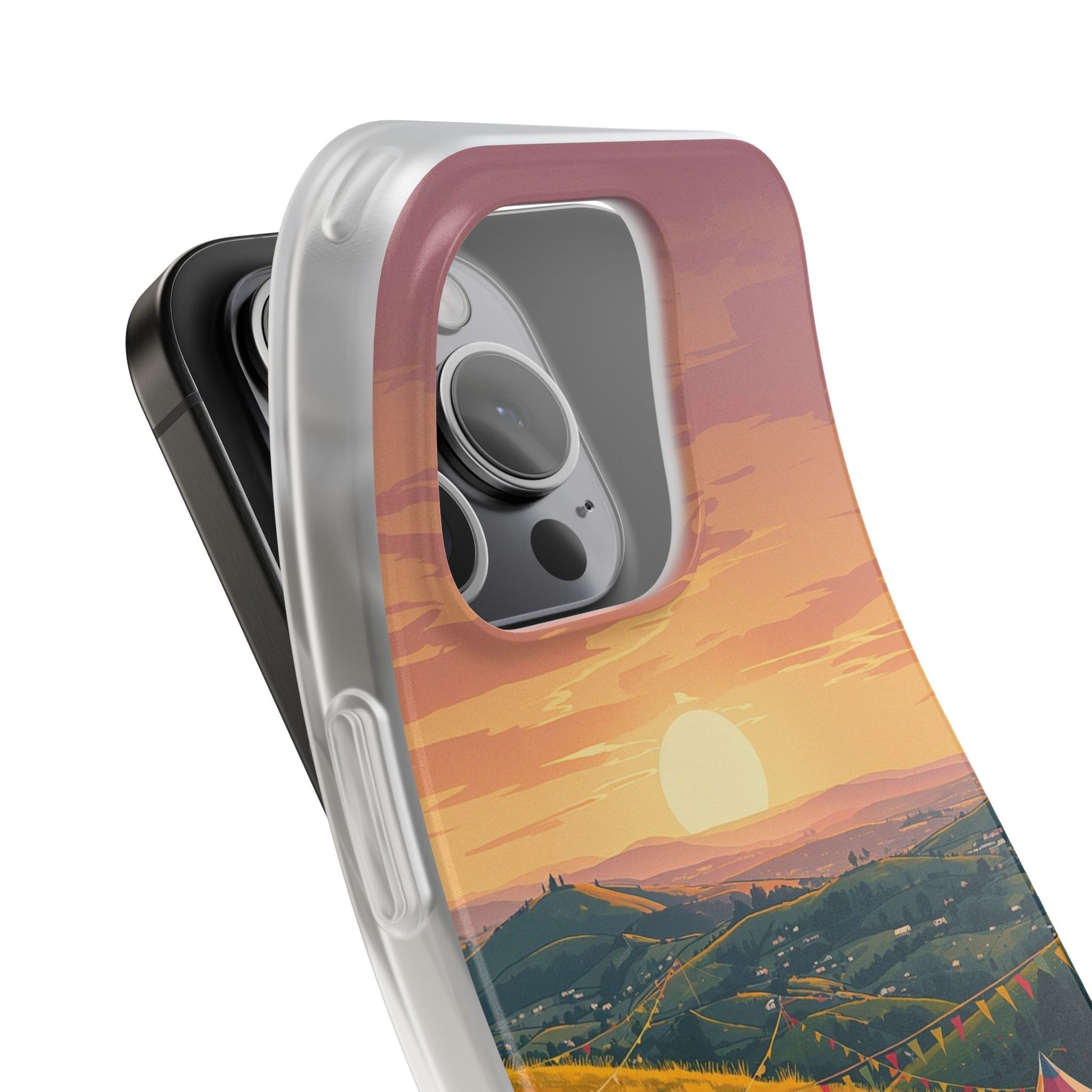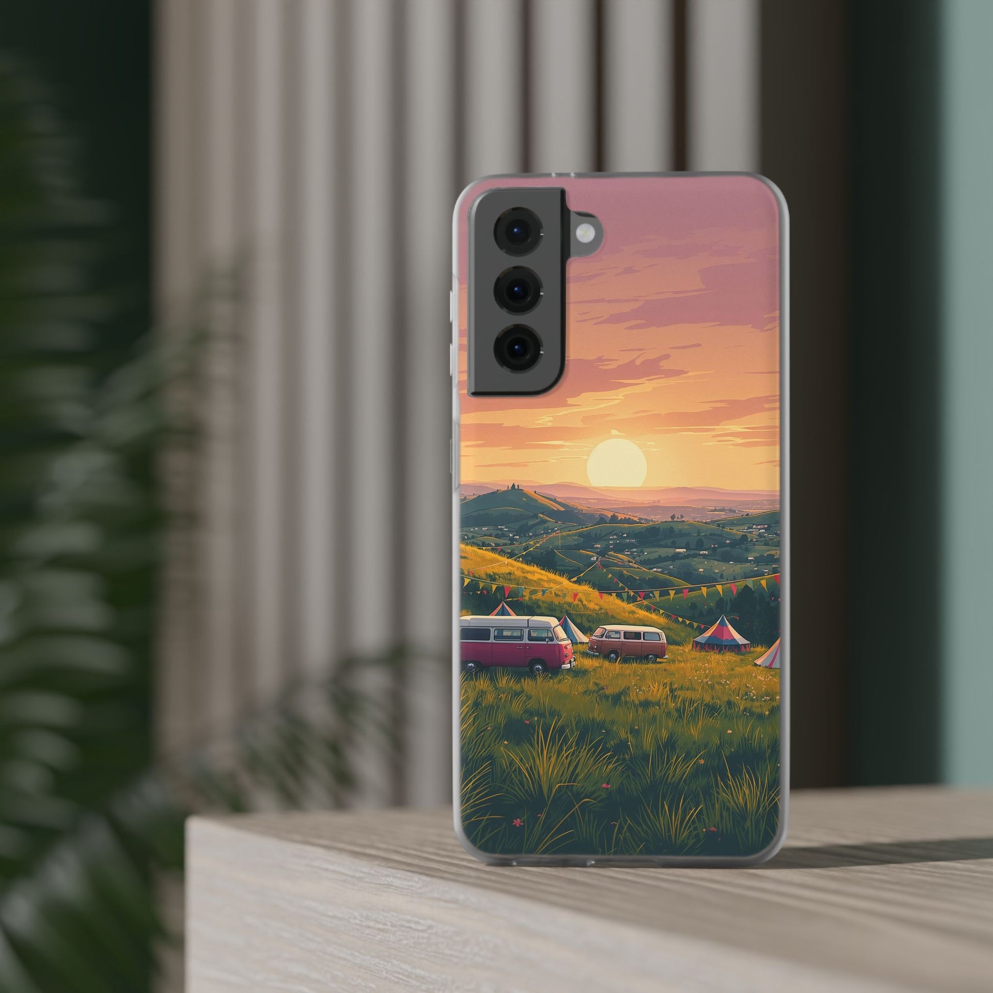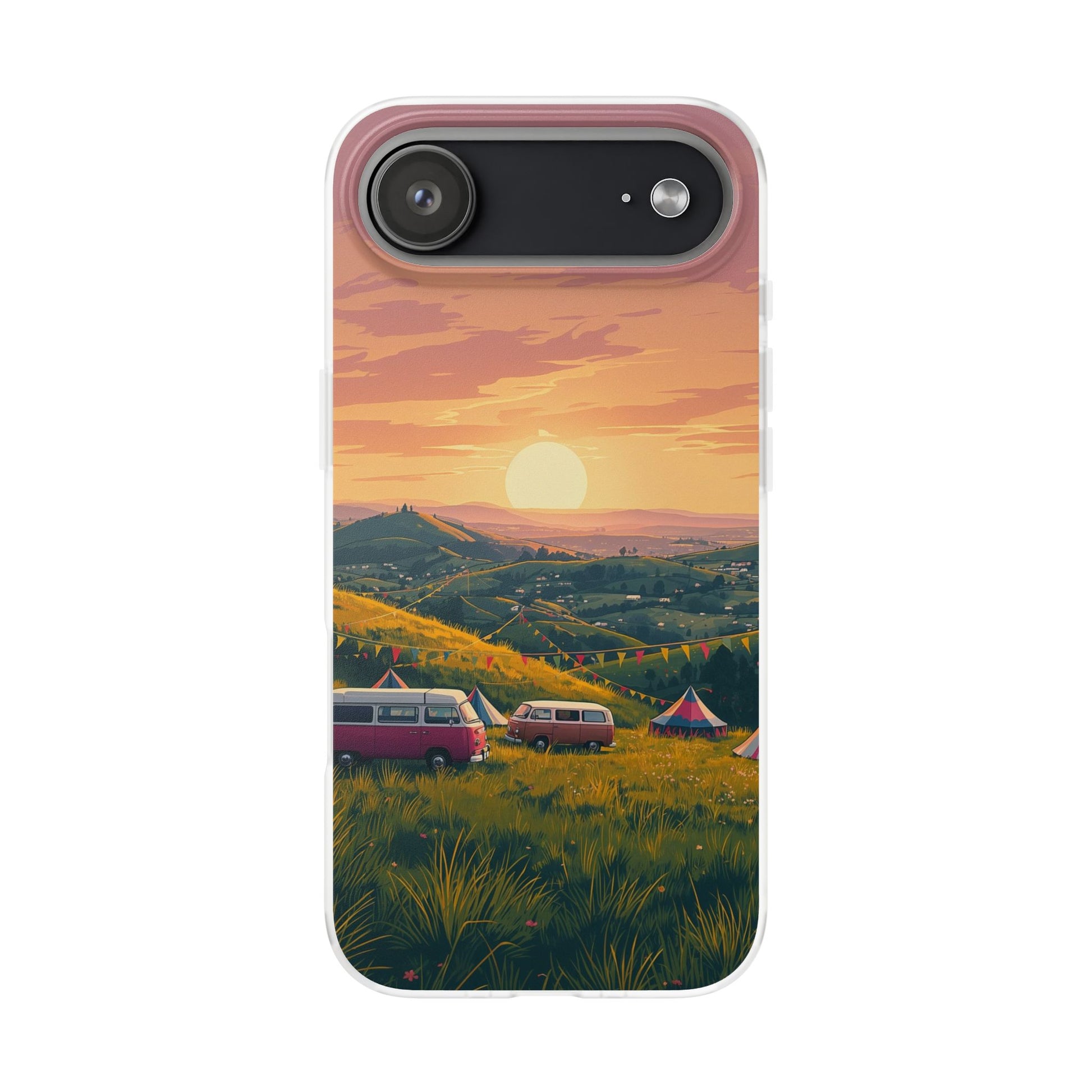 Celebrate summer freedom with our Festival Fields phone case. This vibrant design captures a glowing sunset over rolling green hills, colourful tents, bunting flags fluttering in the breeze, and retro campervans parked in the grass. It’s the perfect tribute to music festivals, road trips, and golden evenings spent under open skies.