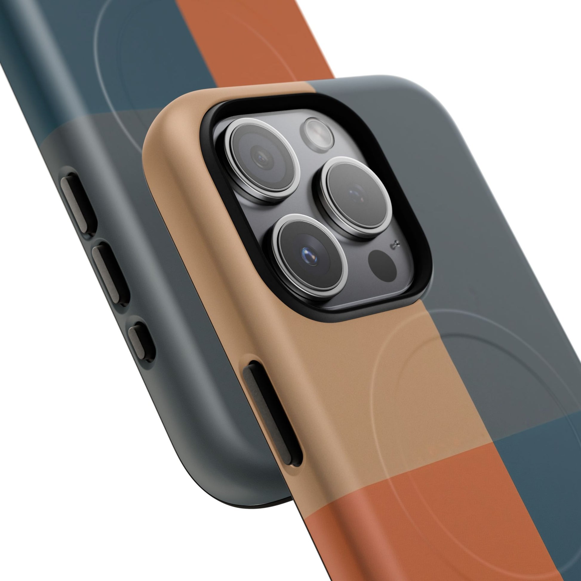 A sleek iPhone MagSafe-compatible tough case featuring the Harbour Grid colourway - a bold geometric mix of tan, charcoal grey, burnt orange, and deep navy. Designed for everyday durability, this dual-layer layout blends modern minimalist styling with reliable, full-coverage protection.