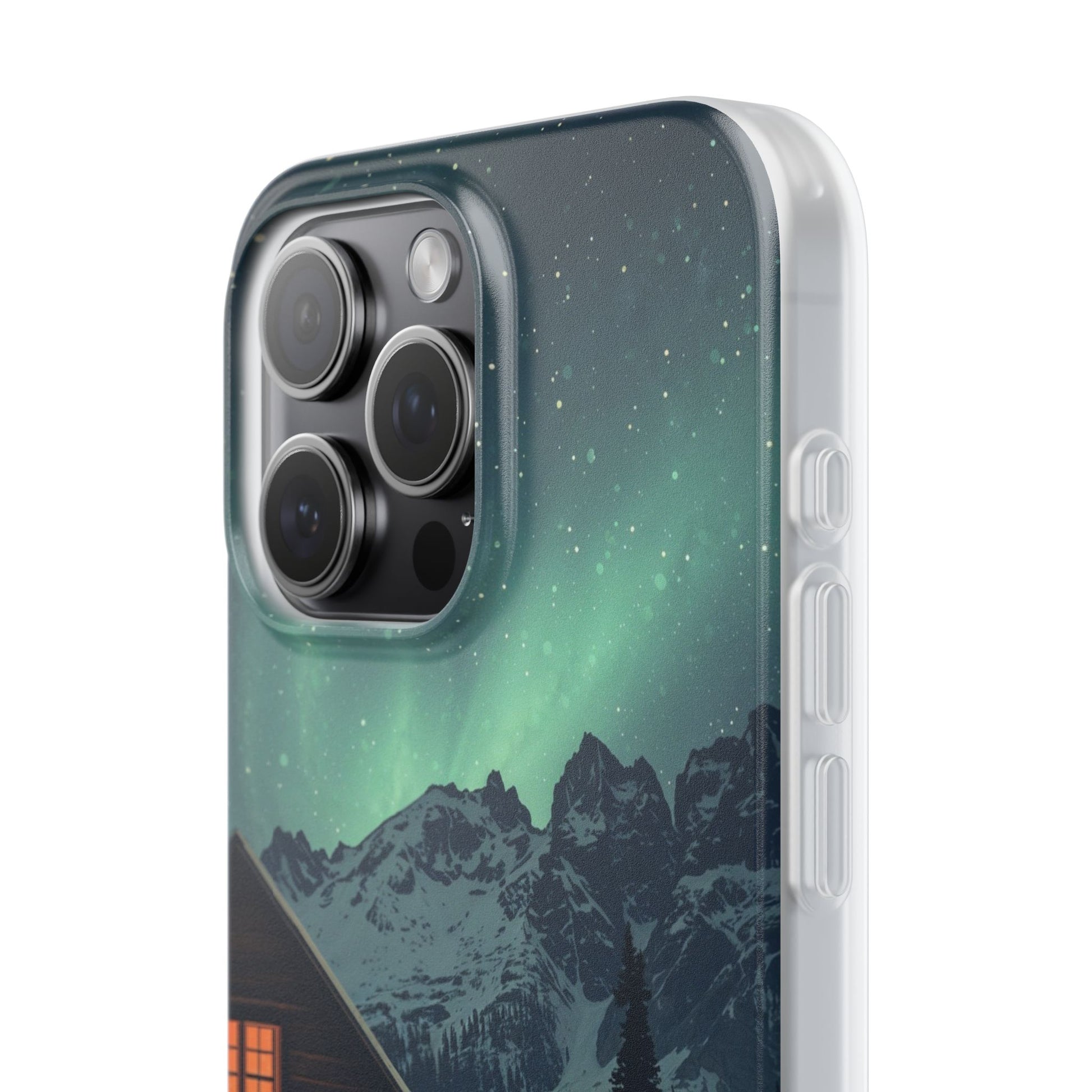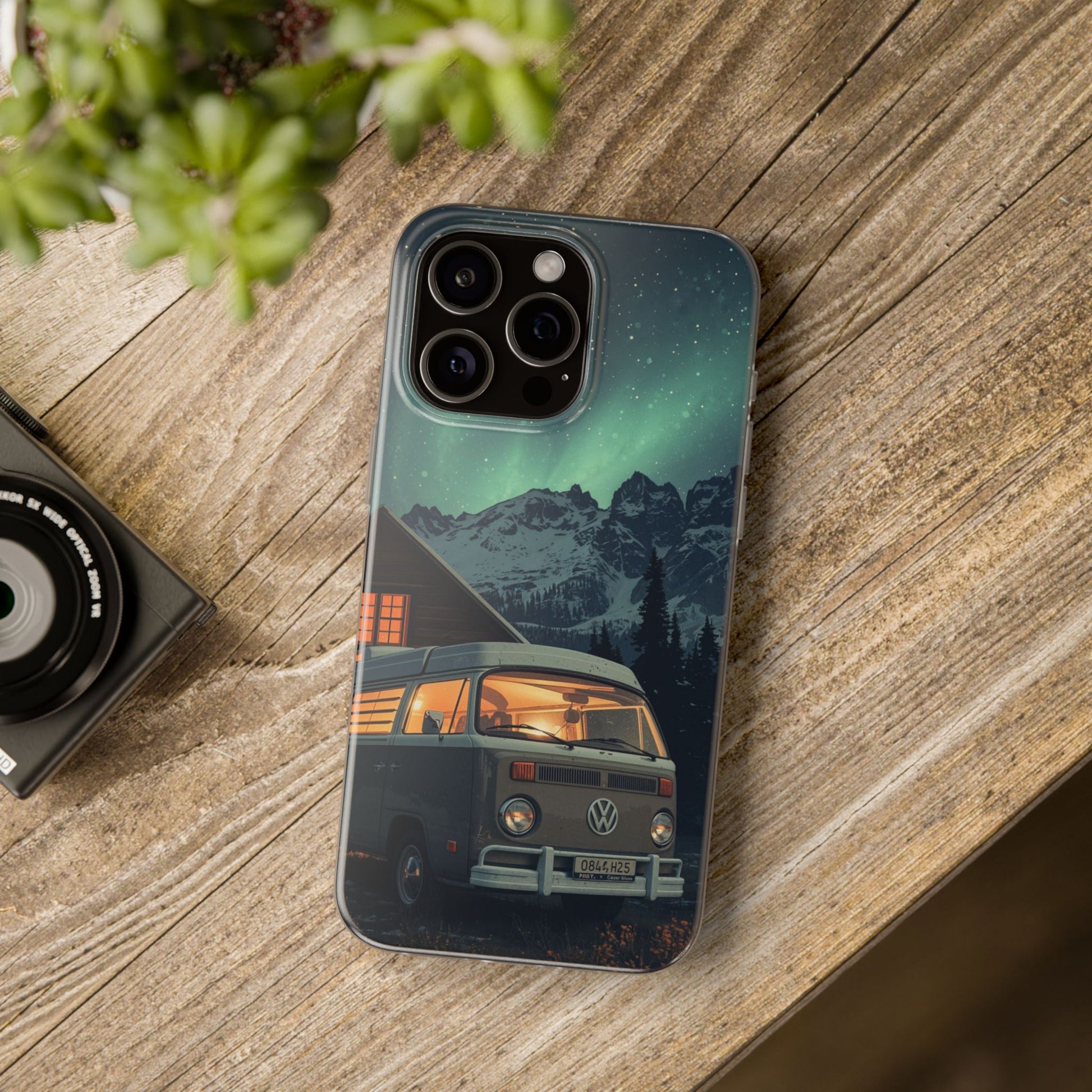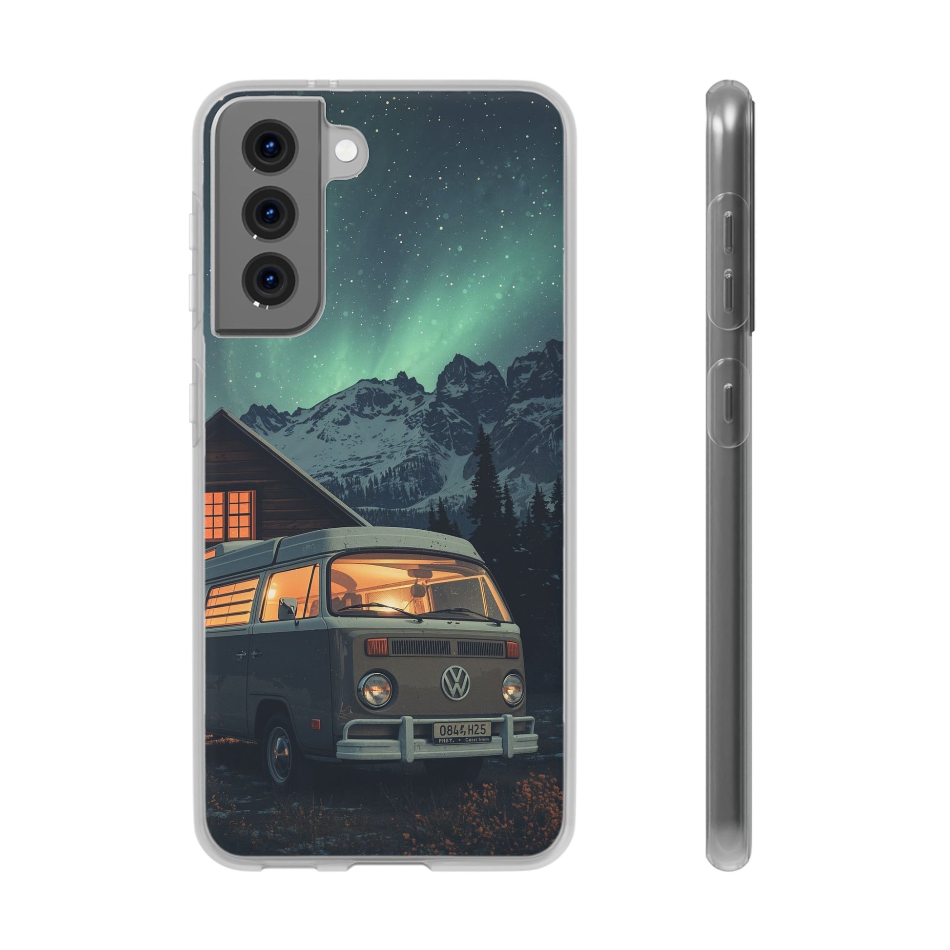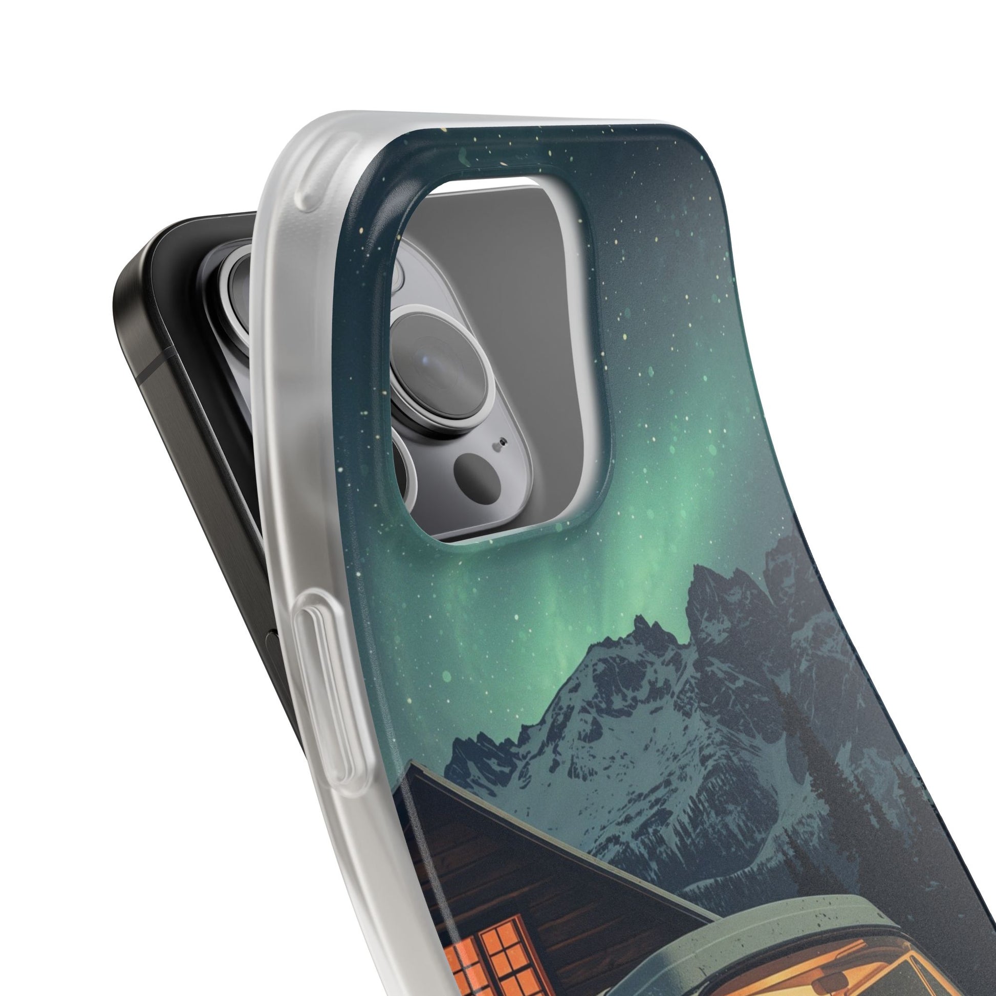 Escape to the tranquillity of the mountains with our Mountain Cabin Getaway phone case. This serene design features a cosy wooden cabin beneath a sky lit by the northern lights, with a retro camper parked outside ready for the next adventure. Snow-capped peaks and a starlit sky create a scene of pure peace and wanderlust.