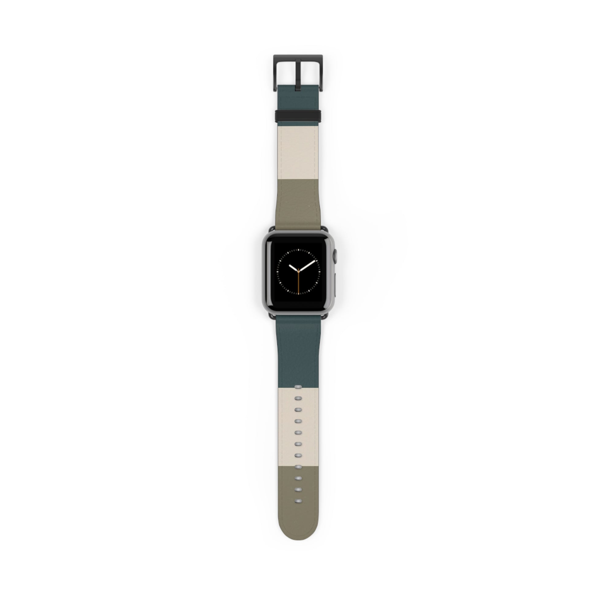 The Nordic Coast Apple Watch strap features a clean, minimalist colour-block design inspired by coastal landscapes and Scandinavian simplicity. Soft tones of deep blue-grey, warm stone, cream and muted olive come together in balanced horizontal panels, creating a calm, understated look that feels fresh and effortlessly wearable.