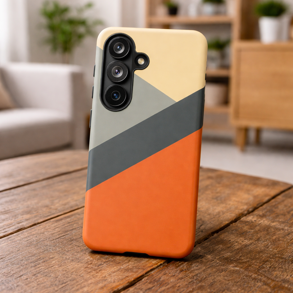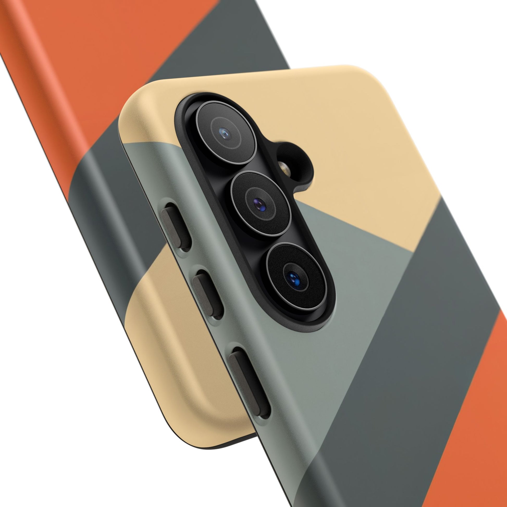 This Samsung Galaxy Ember Angle phone case features a bold geometric design with warm ember orange, soft beige and muted grey tones. The angled composition creates a clean, modern aesthetic inspired by mid-century and contemporary design.