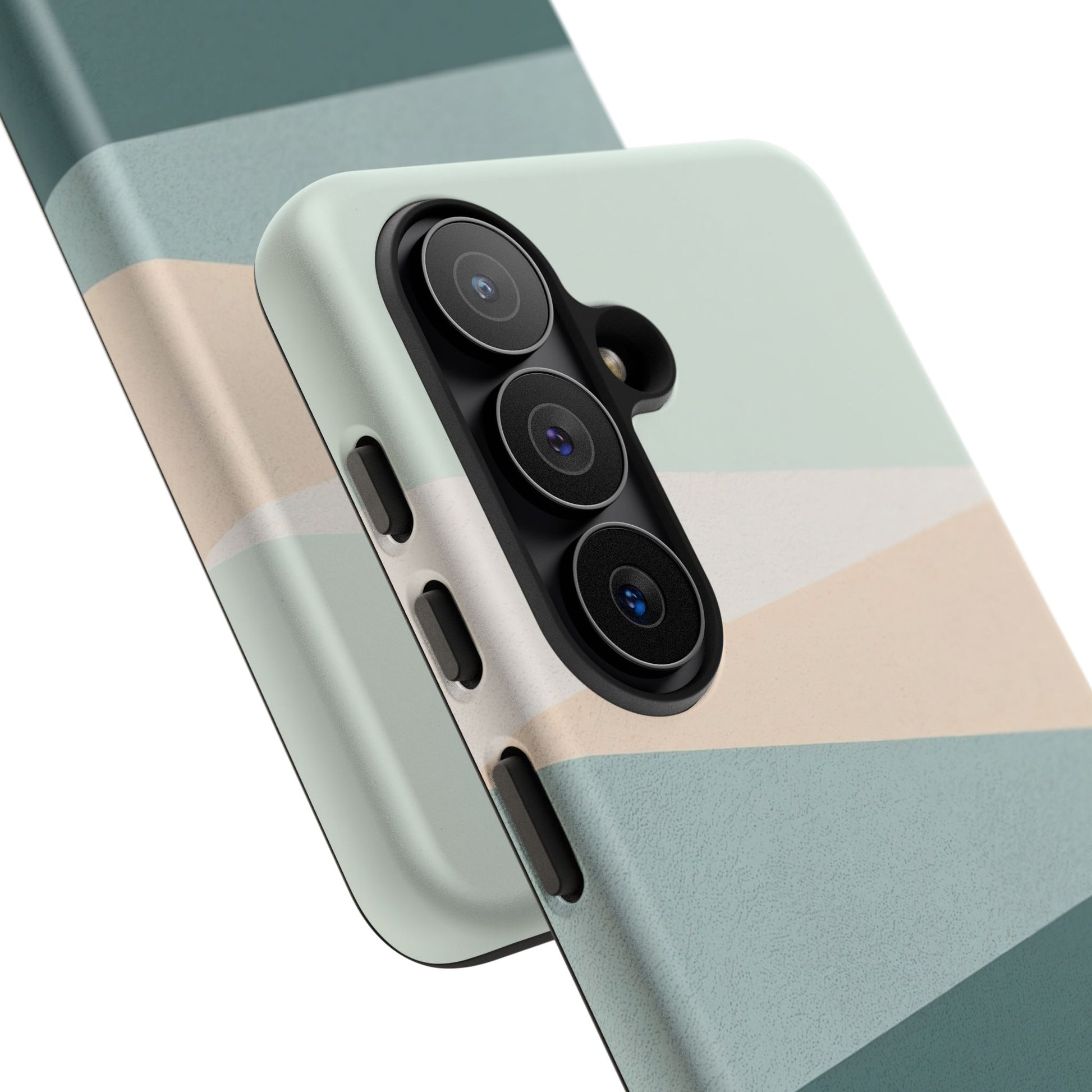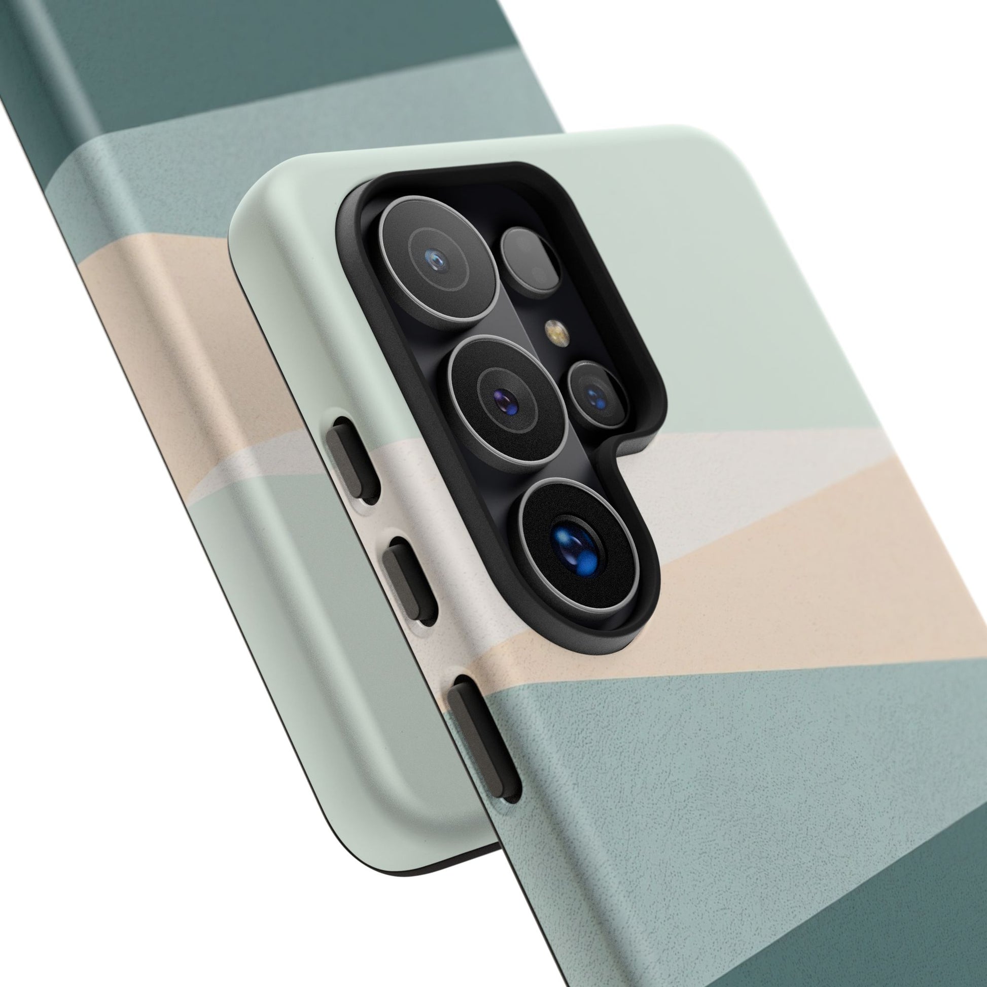 This Samsung Galaxy minimal neutral stripe phone case features a clean, modern design with soft sage green, muted teal and warm neutral tones. The layered stripe pattern creates a calm, contemporary look inspired by Scandinavian interiors and minimalist design.