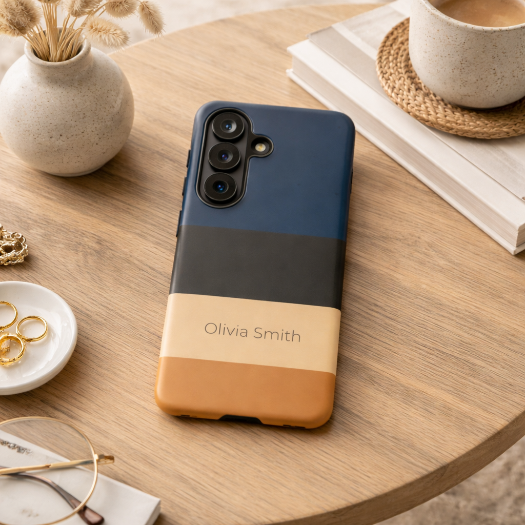 This Samsung Galaxy personalised name phone case features a warm colour block design with earthy tones including burnt orange, soft tan, olive green and cream, finished with your custom name for a unique and personal touch. The clean layout creates a modern yet relaxed aesthetic inspired by natural colour palettes.
