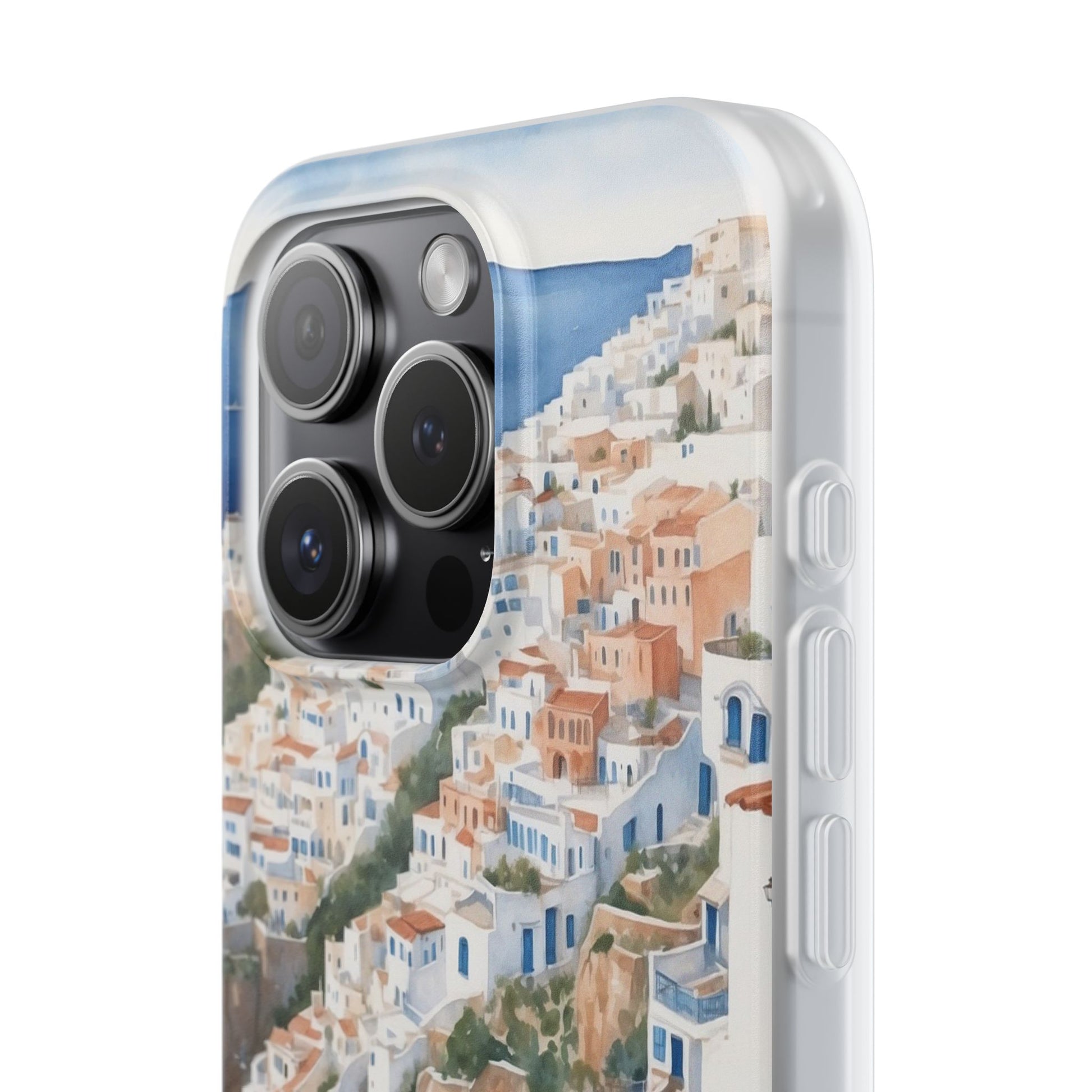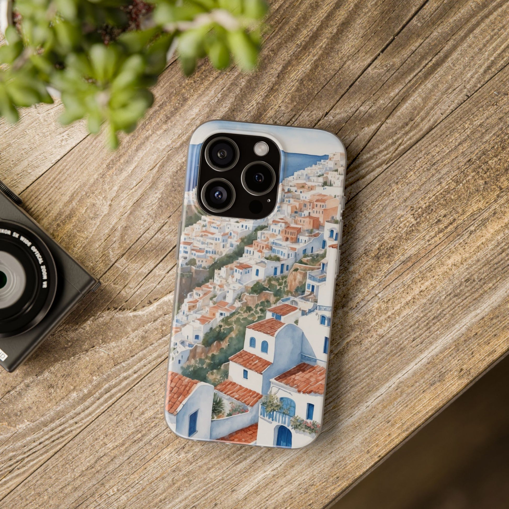 Transport yourself to the winding streets and sunlit shores of the Mediterranean with our Tiled Mediterranean Coastline phone case. This repeating tile pattern is inspired by the charm of Amalfi, Santorini, and other coastal gems. Featuring hand-drawn whitewashed houses, blue rooftops, cobbled paths, and glistening sea views, all illustrated in an elegant ink and watercolor style.