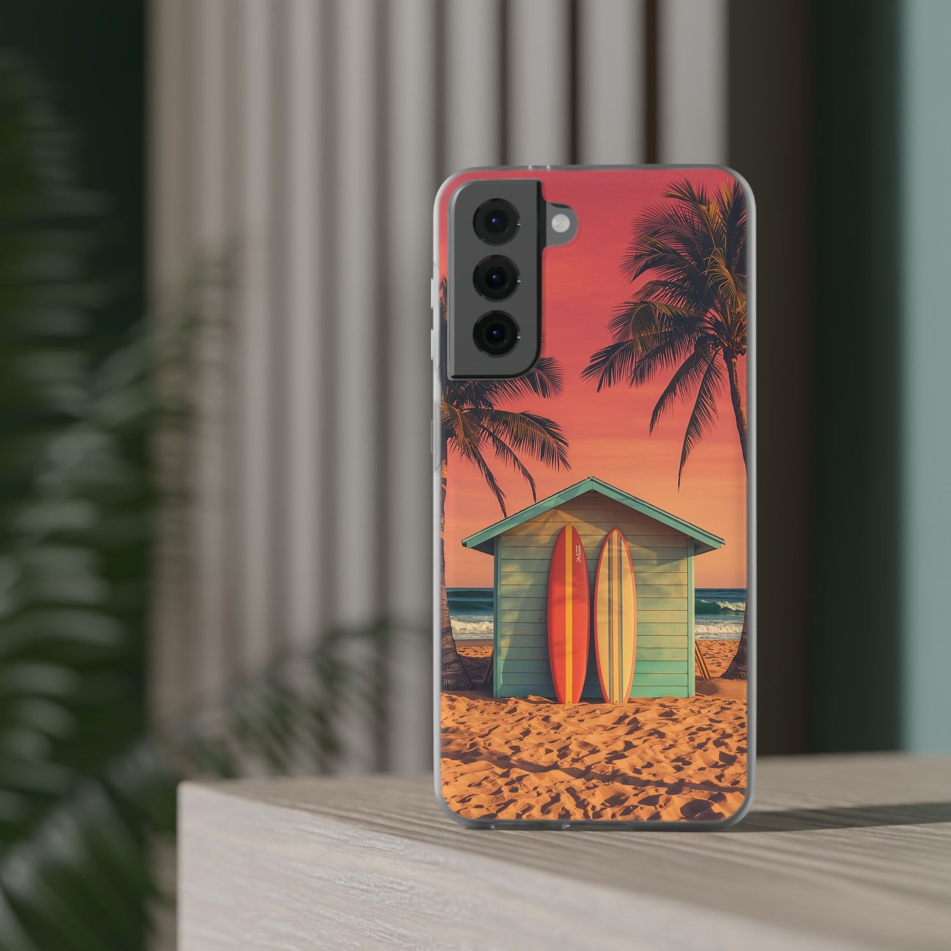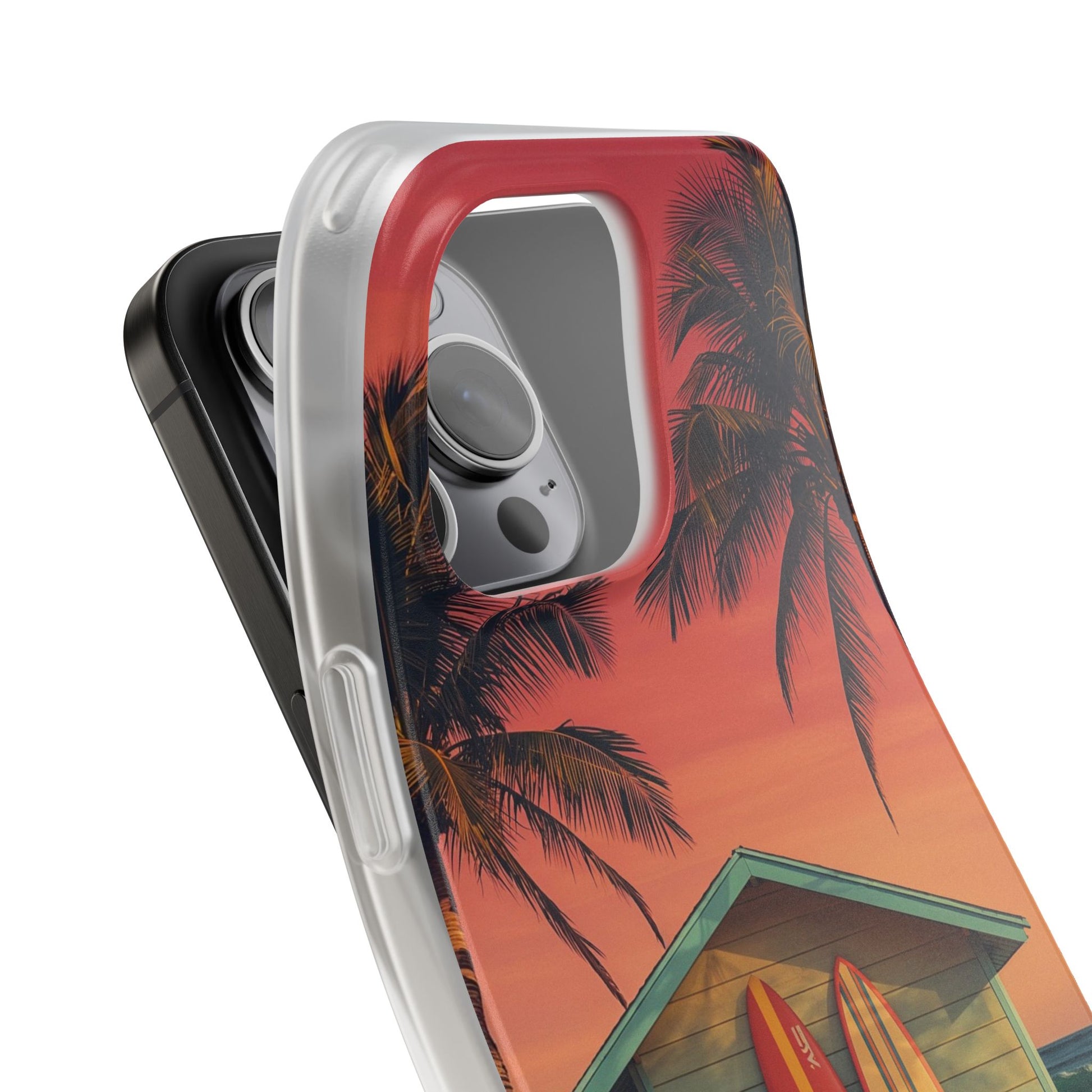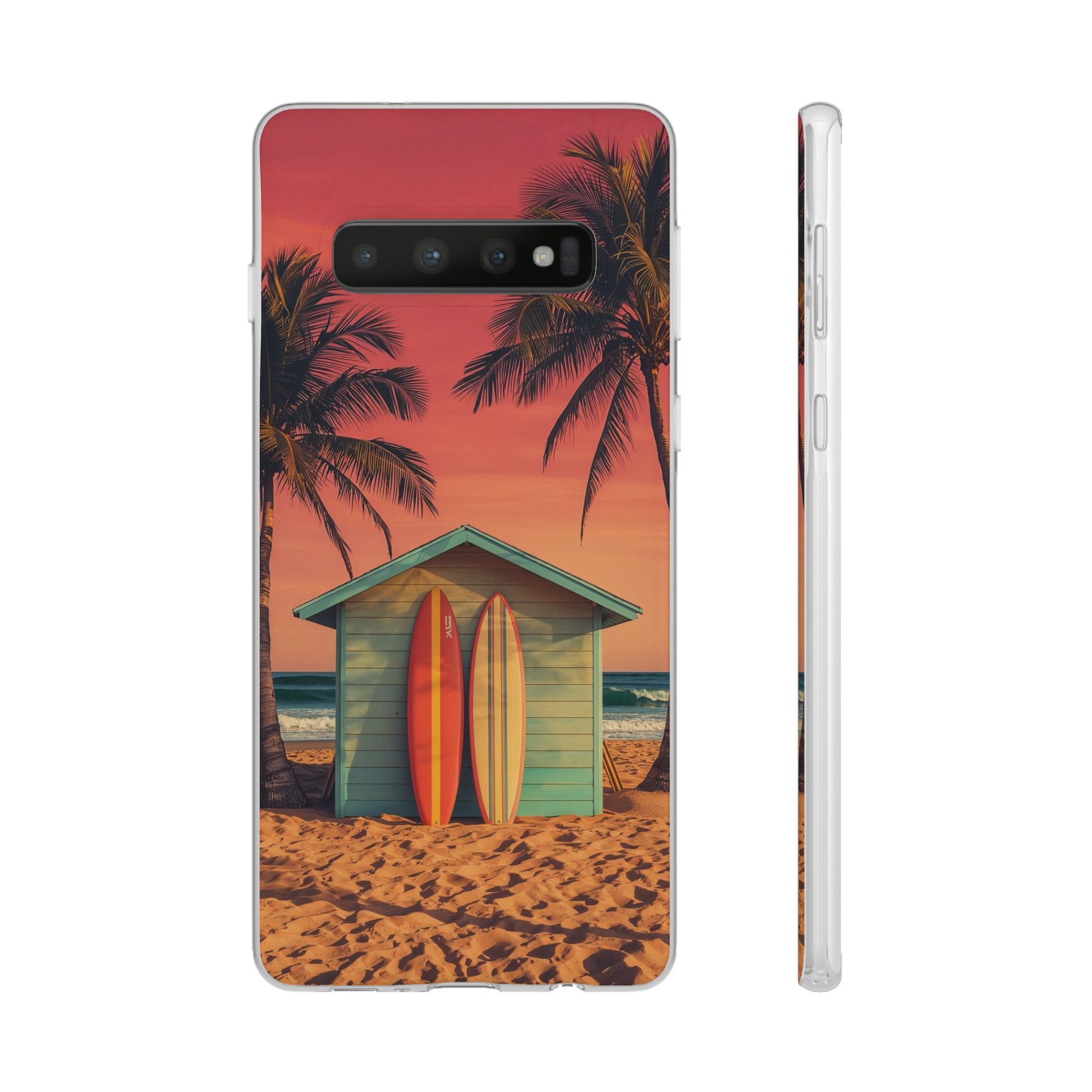 Bring the laid-back spirit of the beach to your everyday style with our Surf Shack Sunset phone case. This vibrant design features a pastel beach hut nestled between swaying palm trees, with two surfboards ready for the next wave, all set against a glowing pink-orange sunset sky. It’s a celebration of endless summer days and the freedom of the surf.
